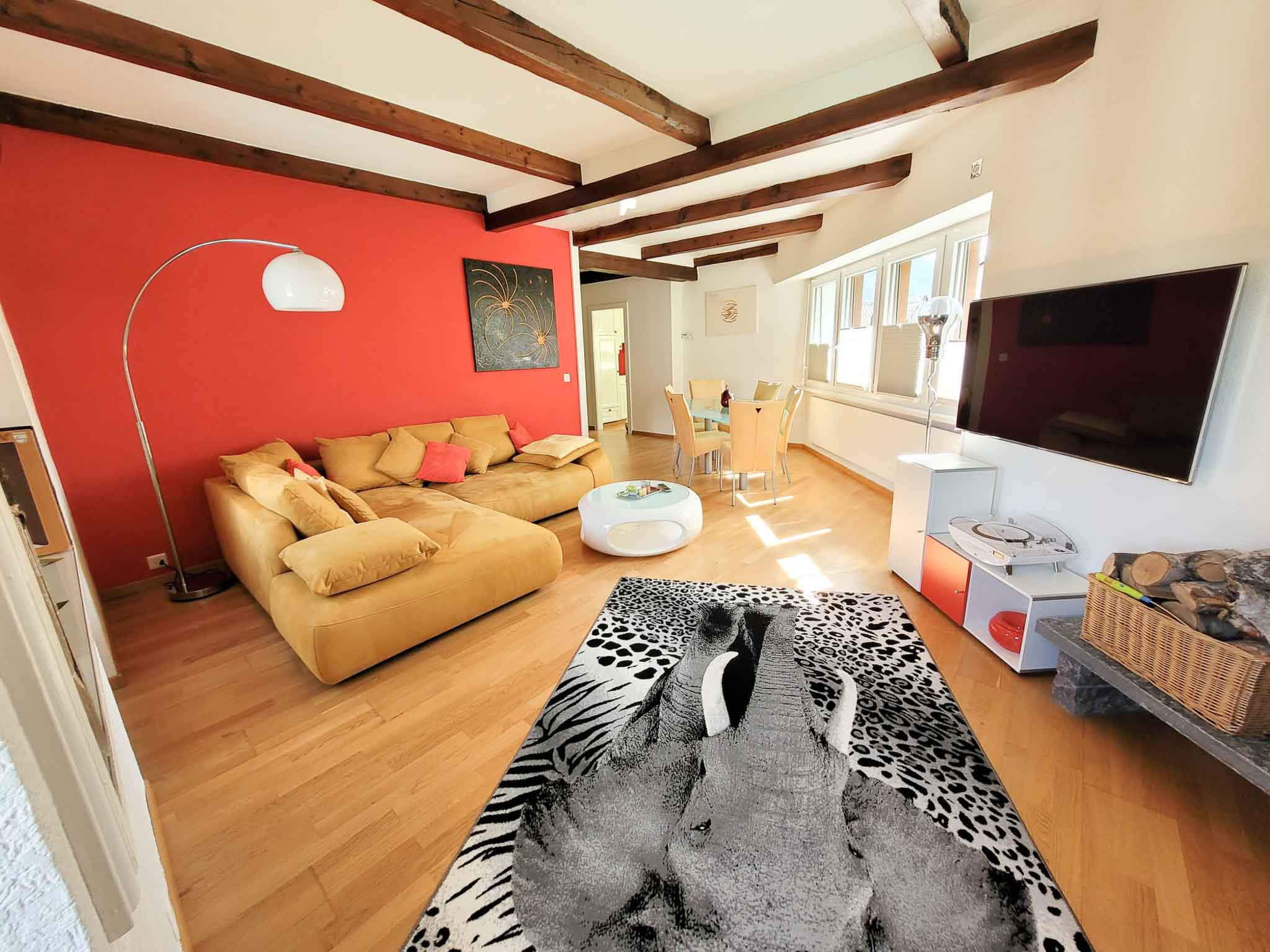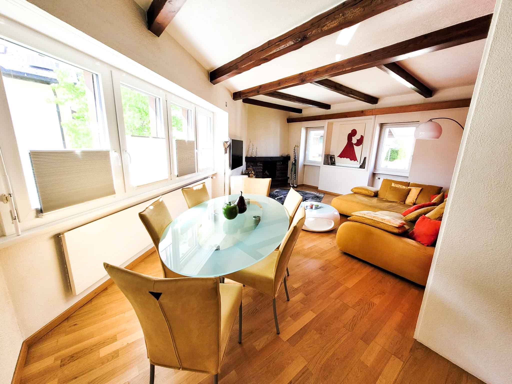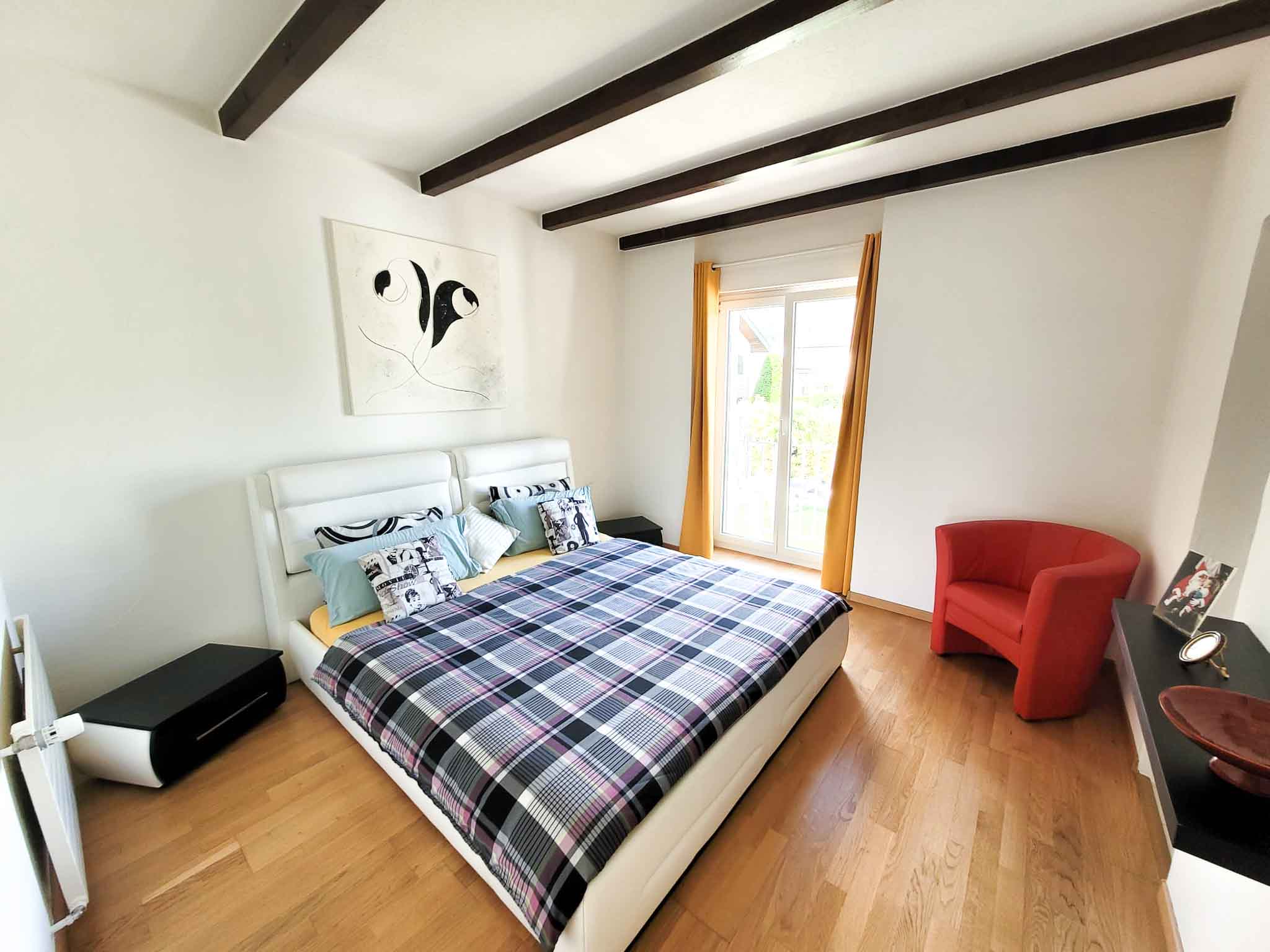 - Grande chambre sous toit (équipée de baie vitrée avec le charme de ses poutres apparantes)